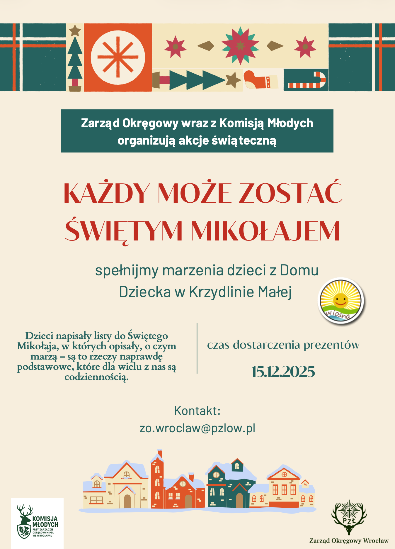 Zarząd Okręgowy PZŁ we Wrocławiu wraz z Komisją Młodych organizuje świąteczną zbiórkę prezentów dla dzieci z Domu Dziecka w Krzydlinie Małej pod hasłem: „Każdy może zostać Świętym Mikołajem” 🎅🎁