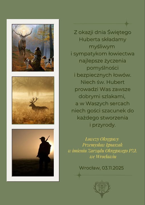 🦌Z okazji naszego wspólnego święta – dnia św. Huberta, patrona myśliwych, leśników i jeźdźców – Zarząd Okręgowy PZŁ we Wrocławiu życzy pomyślności i satysfakcji z uprawiania pięknej pasji łowieckiej.